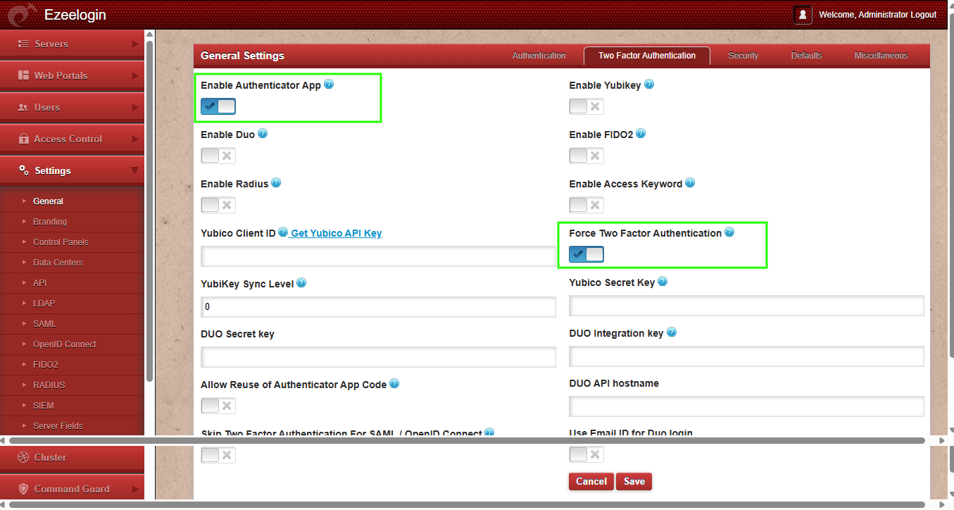 Step 2: Re-enable Force Two-Factor Authentication and any of theTwo-factor Authentication method which was used before. Login to Ezeelogin GUI and navigate to Settings -> General -> Two-Factor Authentication