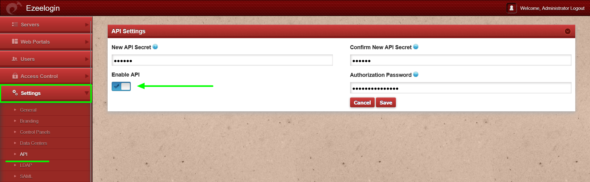 The above screenshot shows that the API secret was enabled by the user 'ezadmin'.