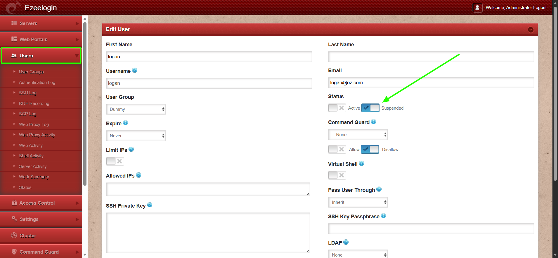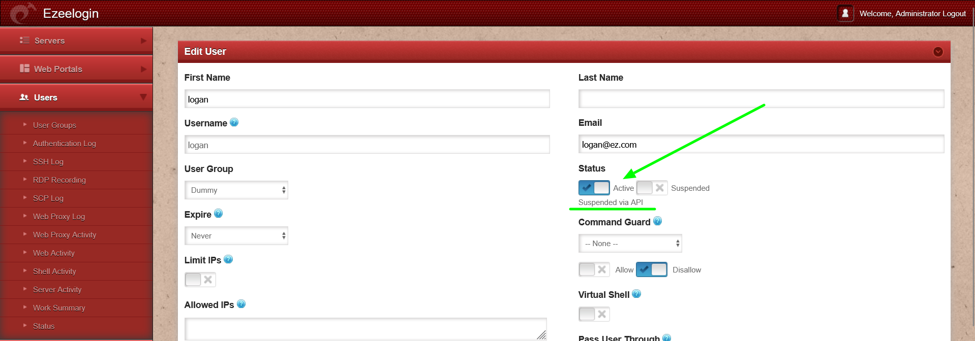 Overview: This article explains how to suspend a user account and terminate its frontend (GUI) and backend (ezsh) sessions using the API. When the suspend script is executed, it will immediately terminate the user's ongoing ezsh and GUI sessions and suspend the account. To unsuspend the user, an admin must run the unsuspend API script or perform the action from the GUI. Refer detailed article for API.