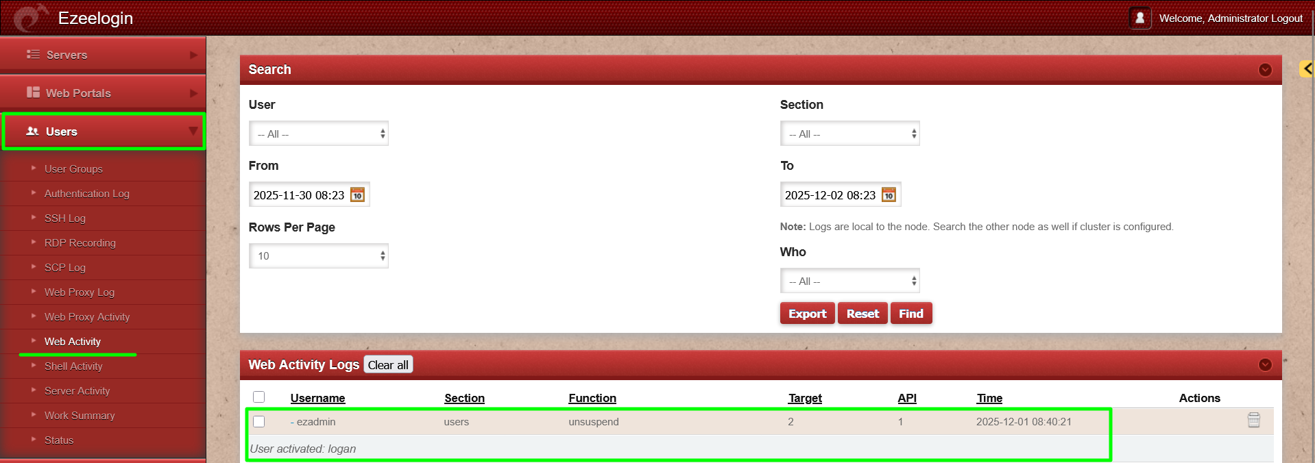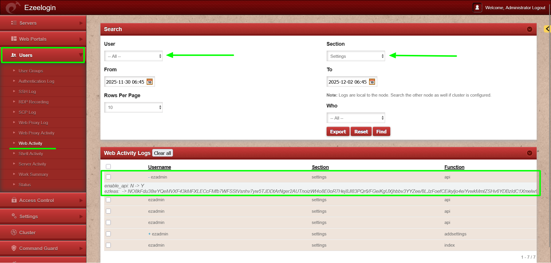 To view the logs, navigate to Users -> Web Activity -> User-All -> Section-Settings -> Find.