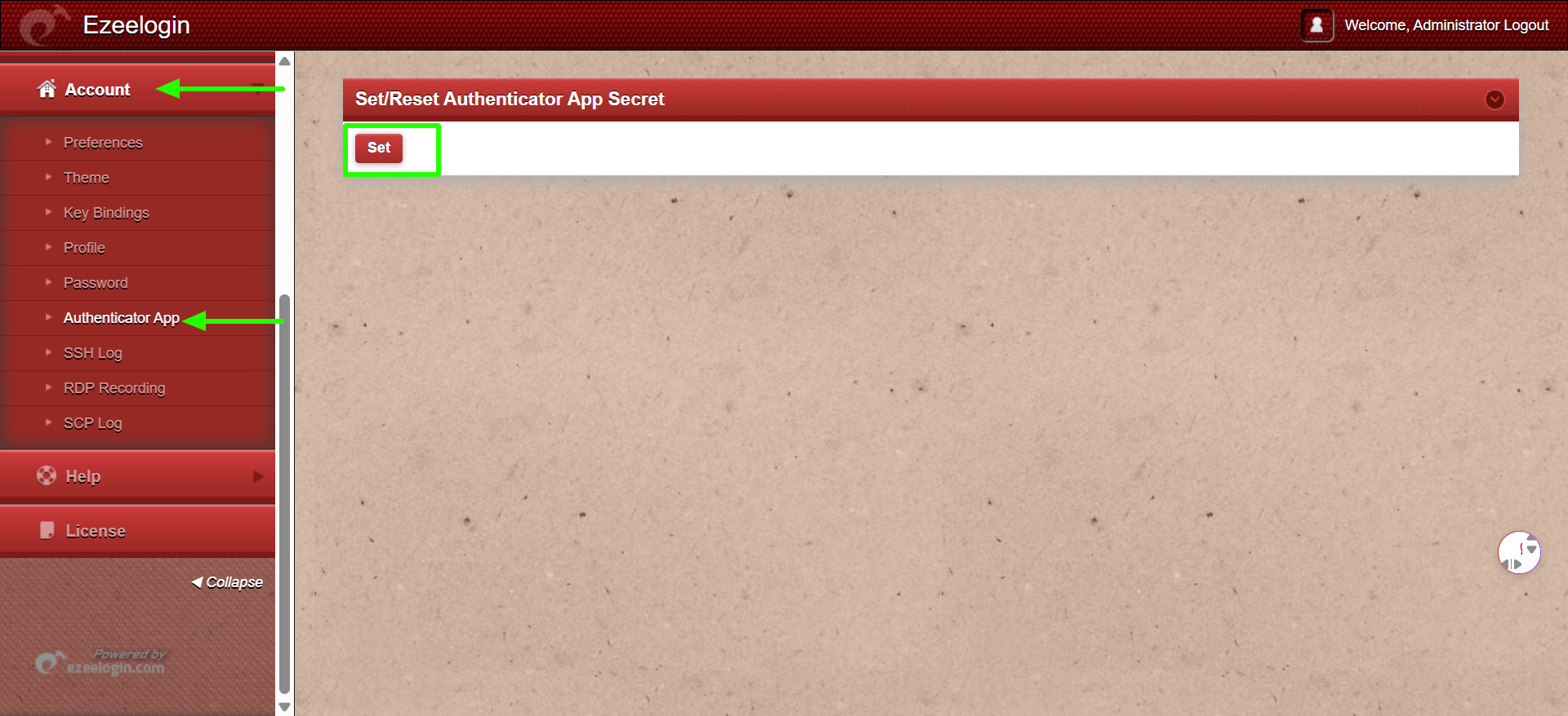Step 1. Users can log in to the web interface and go to Account ->Authenticator App-> Set