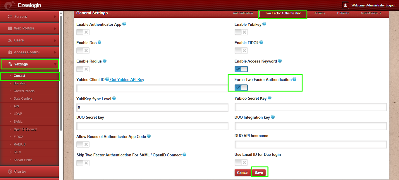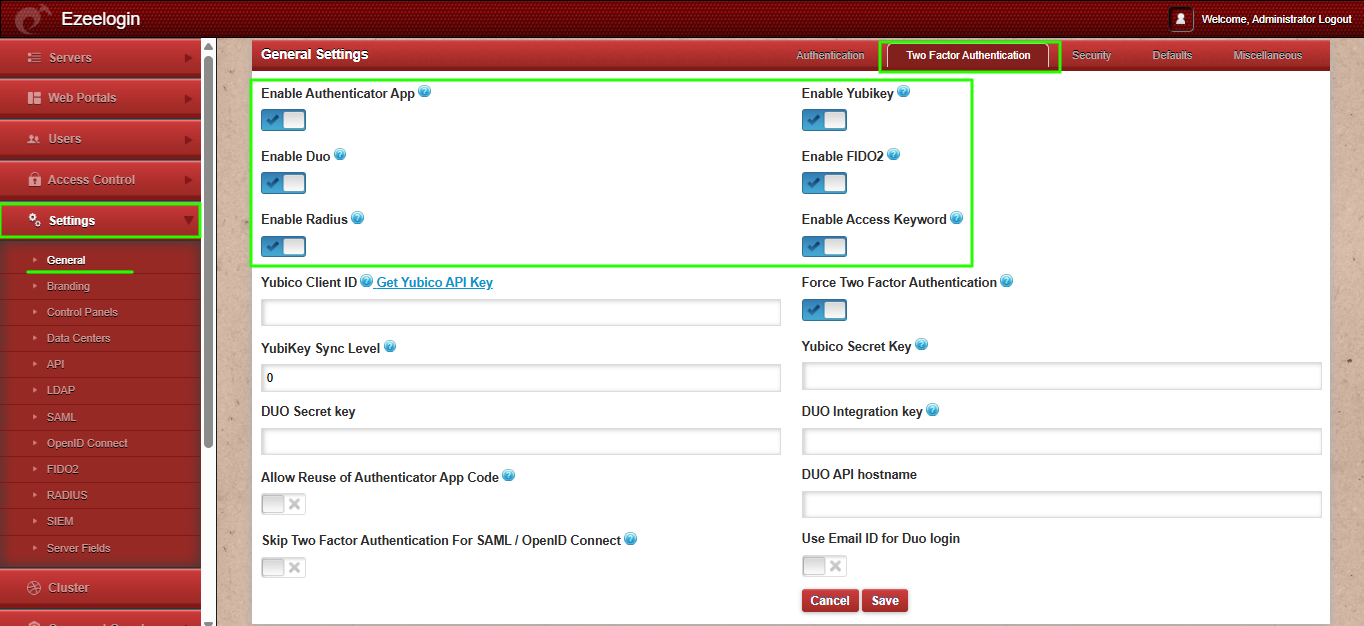 - The two-factor Authentication tab is available only from version 7.11.0. If you are running an old version, then 2fa methods configured under Settings -> General -> Security tab will be available.