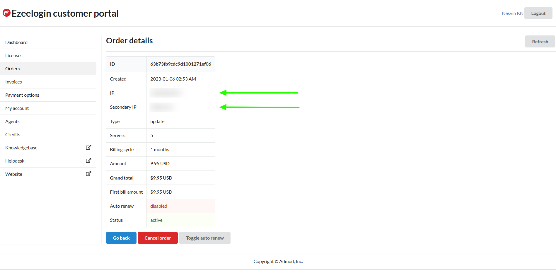 Step 2: Primary and secondary IPs can be found in the order details. Refer below example.