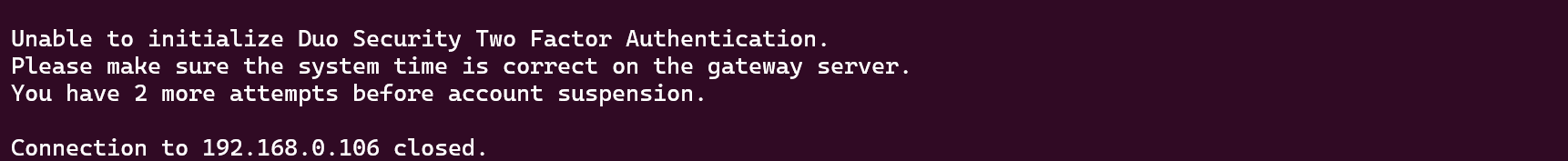Unable to initialize Duo Security Two Factor Authentication. Please make sure the system time is correct on the gateway server.