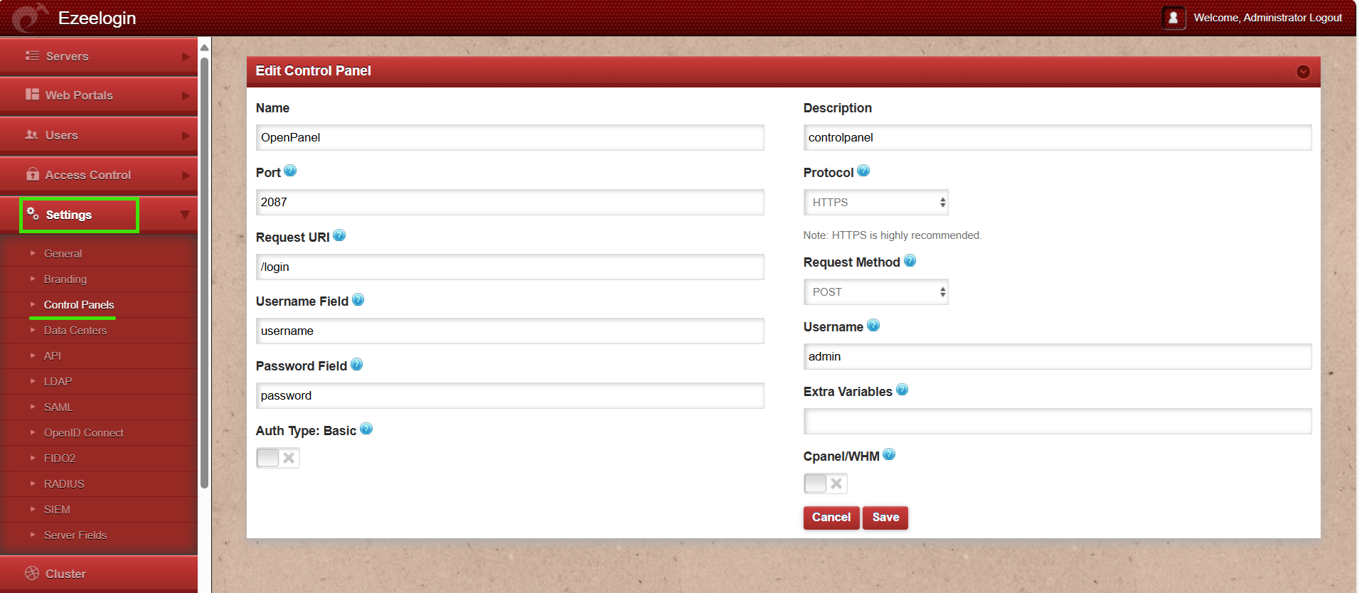 Step 1:To add the control panel, Loginto Ezeelogin GUI interface and navigate to Settings > Control Panels and make sure to fill the form as follows. Refer to the below screenshot.