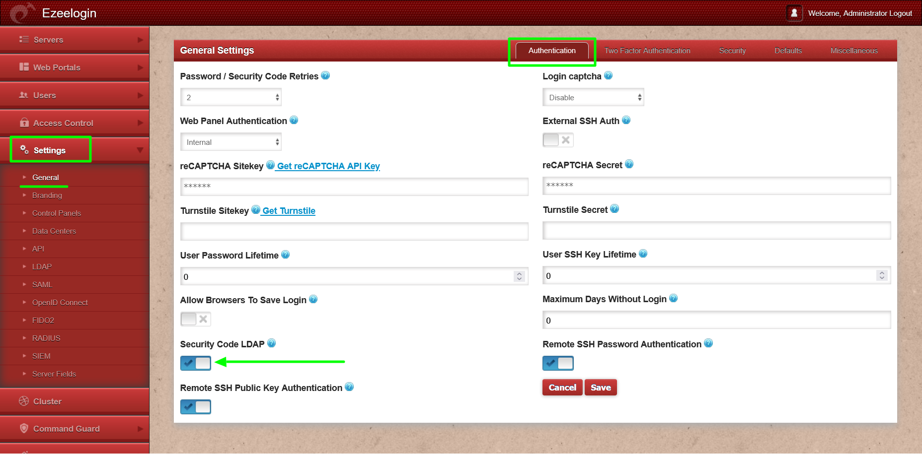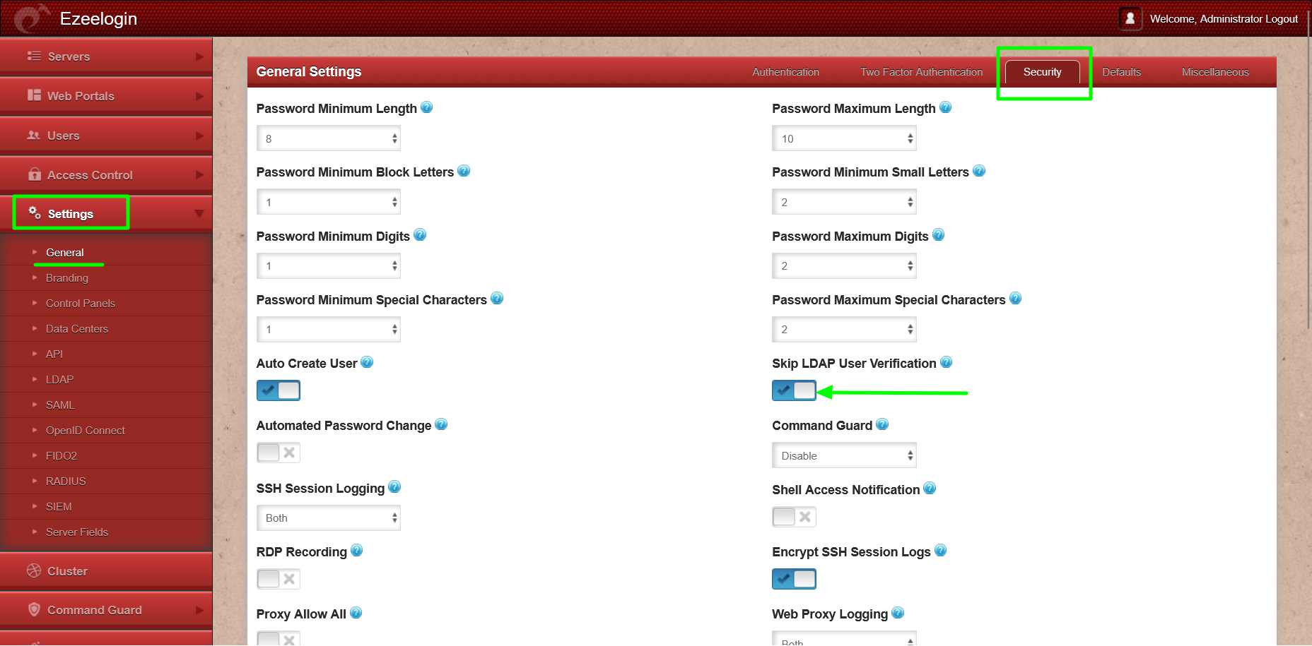 For Ezeelogin version 7.27.6 and above, enable the "Skip LDAP User Verification" option under Settings -> General -> Security -> Skip ldap user verification. This will skip LDAP user verification in the Ezeelogin shell (Ezsh) and disable the Security Code Ldap under Settings -> General -> Authentication -> Security code ldap. Refer below screenshots.