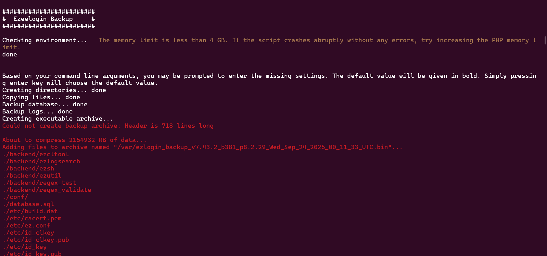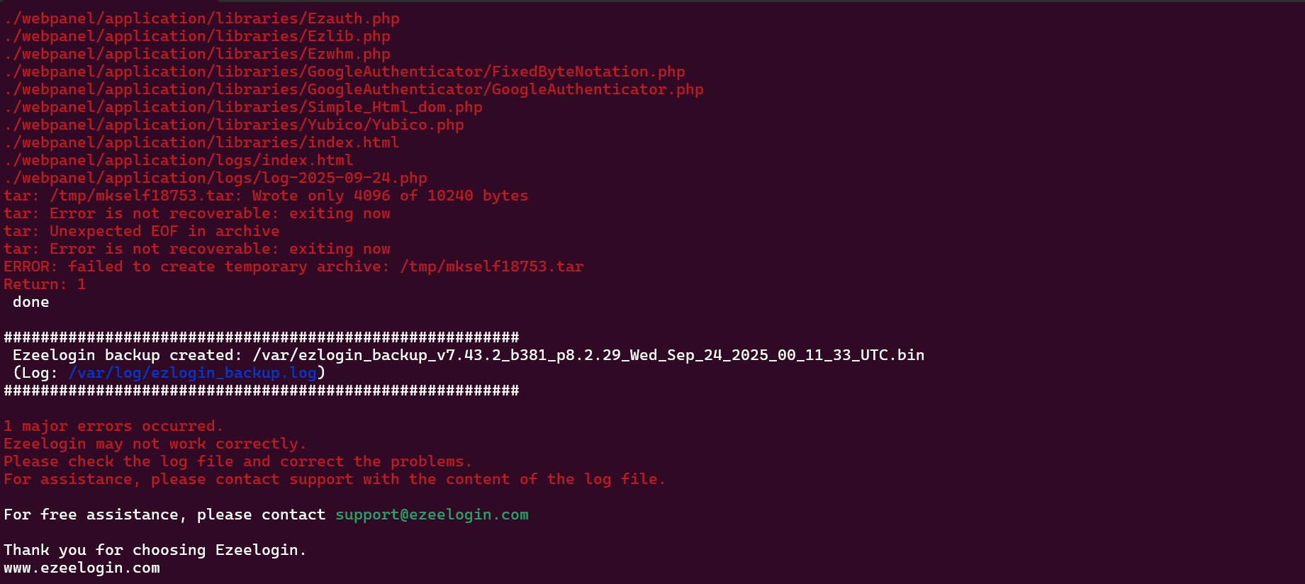 During the backup process, if the Ezeelogin log files have grown significantly in size, there is a chance that you might encounter an error similar to the one shown in the screenshot when running the backup script /usr/local/sbin/backup_ezlogin.php. The trace setting generates detailed debugging information, which significantly increases the size of the log files over time. As a result, the backup script may fail or produce errors when attempting to include these large log files in the backup archive.