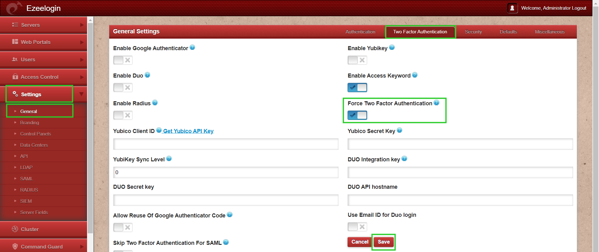 - The two-factor Authentication tab is available only from version 7.11.0. If you are running an old version, then 2fa methods configured under Settings -> General -> Security tab will be available.