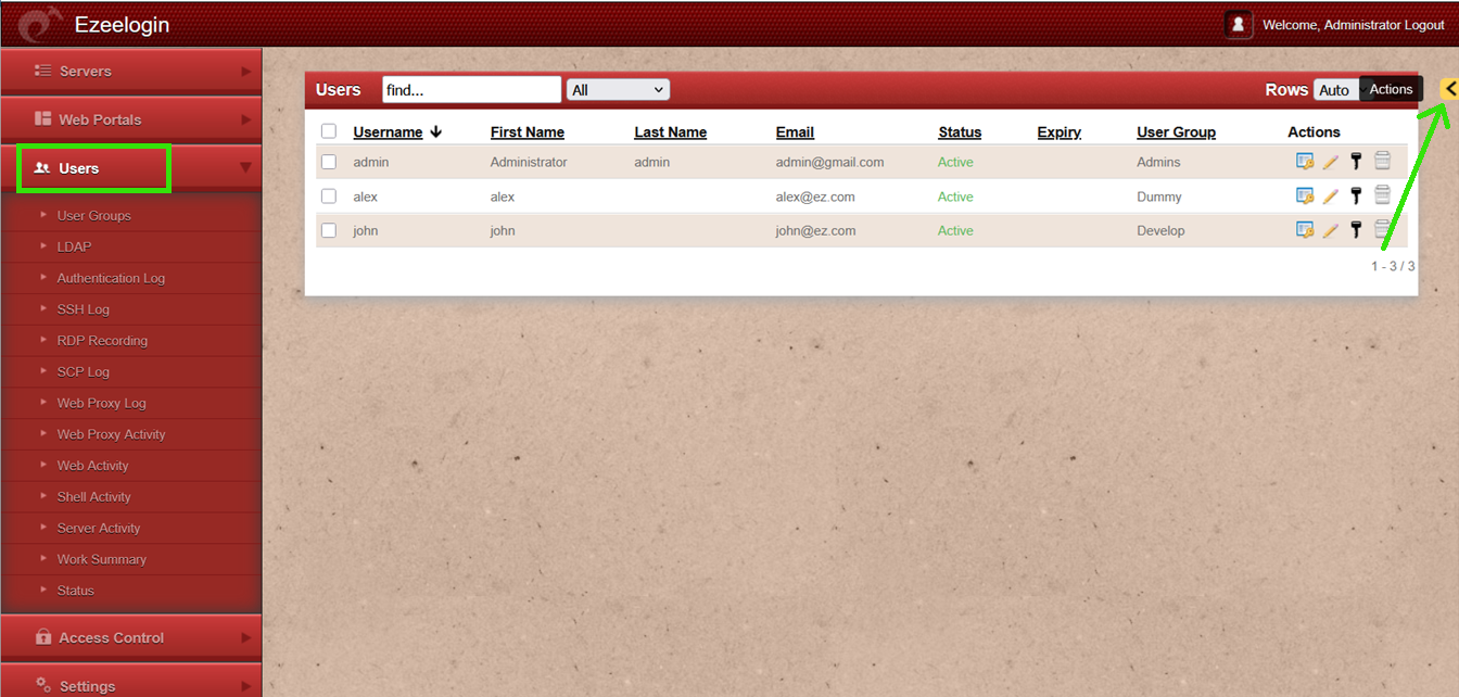 Step 1: Navigate to the Users menu in the ezeelogin gui. Click on the arrow icon located in the top-right corner of the tab.