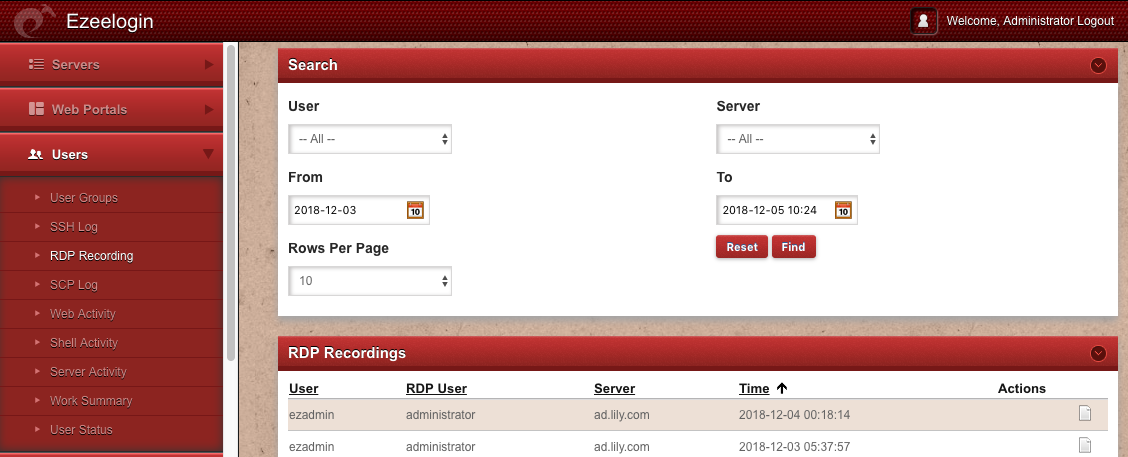 - User The name of the user whose logs has to be found or searched. All means, it would search for the RDP Session recordings of all the Ezeelogin Users.