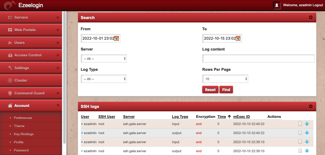 SSH Log ssh gateway user can view and download one's own ssh activities that are recorded under the user Account making it possible for a self review.