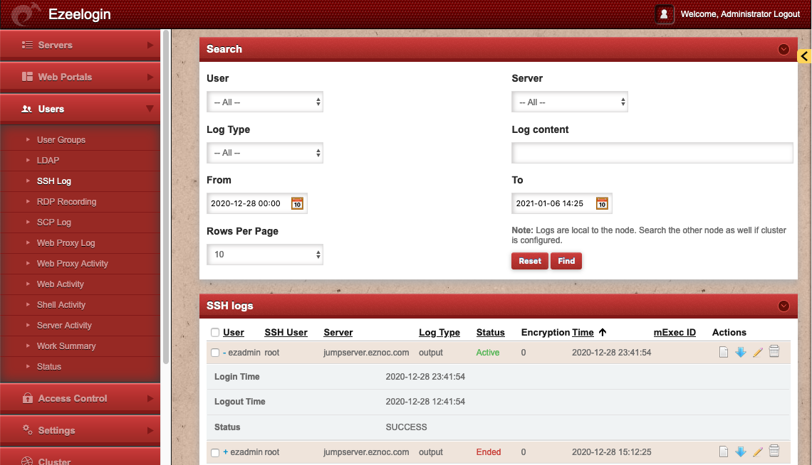 Keeps a log for all actions performed by the Users in the ezeelogin shell and provides an interface to view and search through the activities of all ezeelogin.