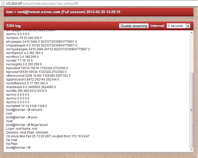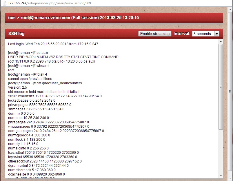 to see in real time what the users are doing in ssh on the servers. The refresh interval can be set between 1-5 seconds. The smaller the value, faster the refresh..Click