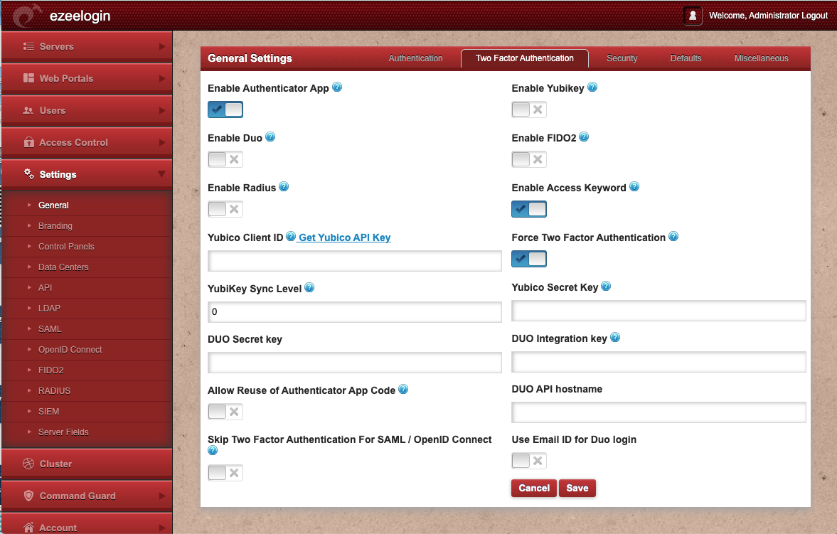 - Enable Access Keyword Enable it so that Access Keyword 2fa is available globally as a 2 Factor option.